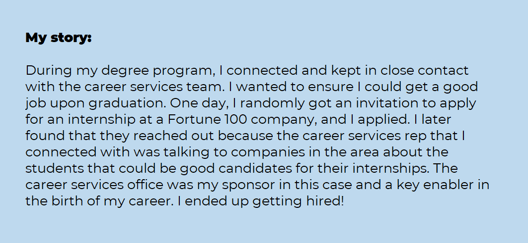 Sponsors help connect you to opportunities. Sponsors talk about you when you aren’t in the room – in a good way. In a school setting, these are people who can help get your name out there, especially if you are looking for a job. For example, companies often work with schools to recruit prospective interns or new full time hires. When they do, you’re more likely to get recommended for those opportunities when you have sponsors in the right places. Depending on your goals, build relationships with people who can positively impact them even when you are not around.